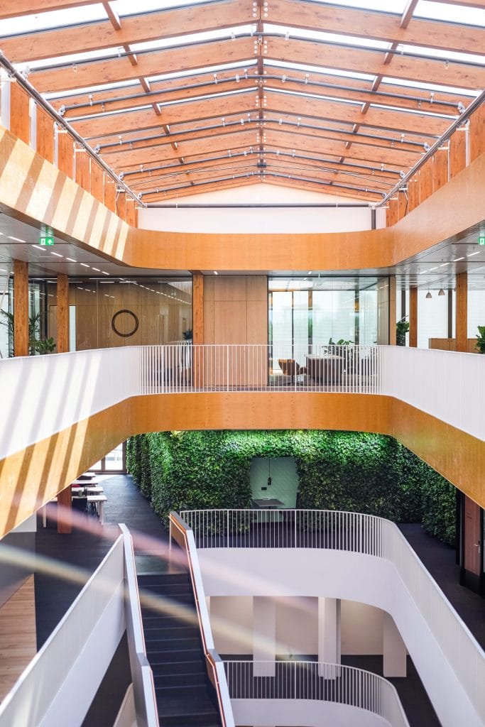 Moderne Büroräume im Amsterdamer Finanzviertel Zuidas mit hochwertiger Ausstattung und Blick auf die Stadt.